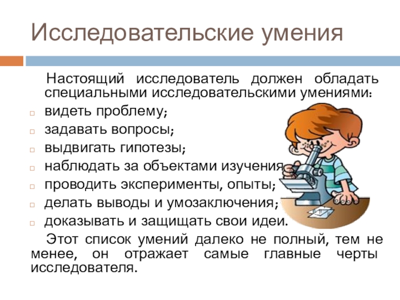 Настоящий исследователь должен обладать специальными исследовательскими умениями: