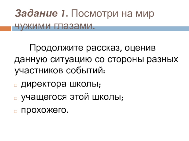 Слайд 5Задание 1. Посмотри на мир чужими глазами.