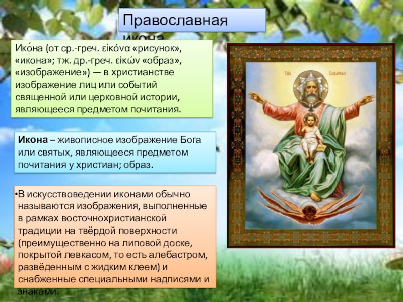 Икона – живописное изображение Бога или святых, являющееся предметом почитания у христиан; образ.