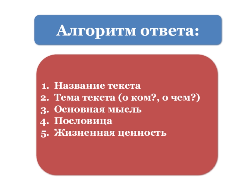 Алгоритм ответа:Название текстаТема текста (о ком?, о чем?)Основная мысльПословицаЖизненная ценность
