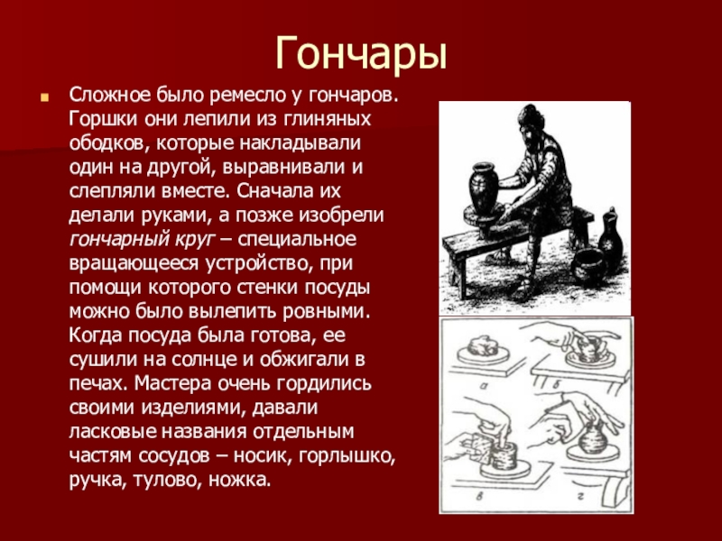 которые накладывали один на другой, выравнивали и слепляли вместе. Сначала их делали руками, а позже изобрели гончарный круг – специальное вращающееся устройство, при помощи которого стенки посуды можно было вылепить ровными. Когда посуда была готова, ее сушили на солнце и обжигали в печах. Мастера очень гордились своими изделиями, давали ласковые названия отдельным частям сосудов – носик, горлышко, ручка, тулово, ножка.