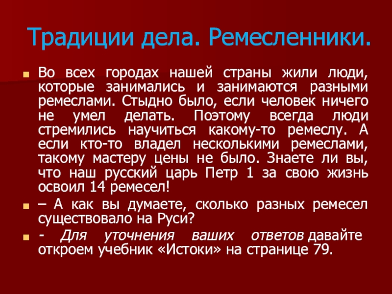и занимаются разными ремеслами. Стыдно было, если человек ничего не умел делать. Поэтому всегда люди стремились научиться какому-то ремеслу. А если кто-то владел несколькими ремеслами, такому мастеру цены не было. Знаете ли вы, что наш русский царь Петр 1 за свою жизнь освоил 14 ремесел!