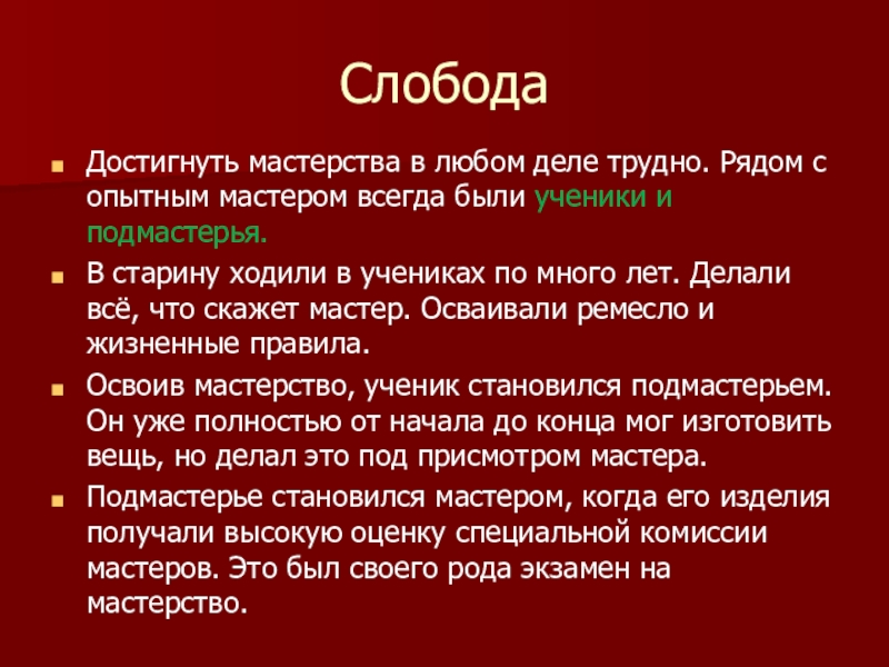 Подмастерье становился мастером, когда его изделия получали высокую оценку специальной комиссии мастеров. Это был своего рода экзамен на мастерство.