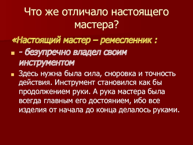 Здесь нужна была сила, сноровка и точность действия. Инструмент становился как бы продолжением руки. А рука мастера была всегда главным его достоянием, ибо все изделия от начала до конца делалось руками.