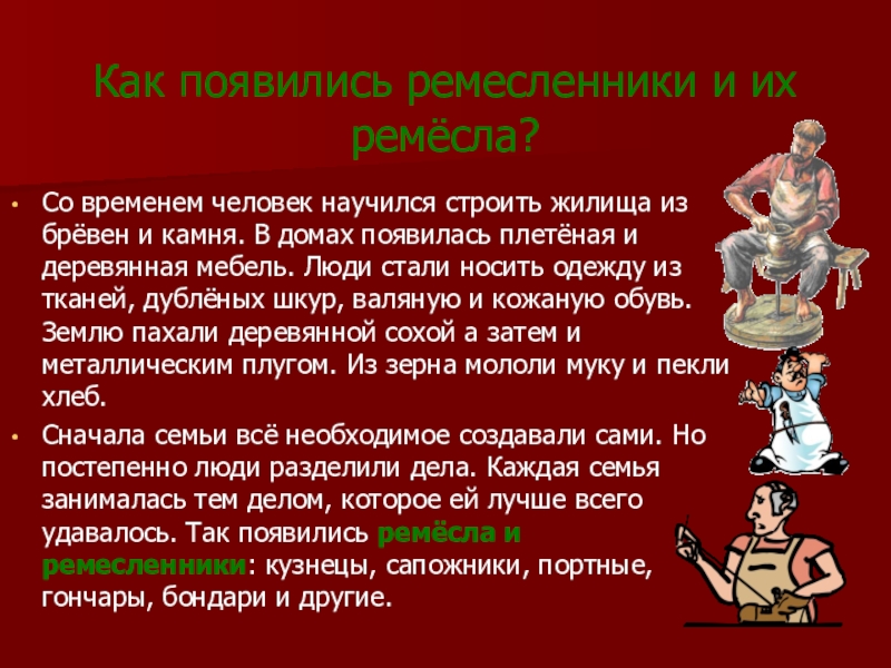 Сначала семьи всё необходимое создавали сами. Но постепенно люди разделили дела. Каждая семья занималась тем делом, которое ей лучше всего удавалось. Так появились ремёсла и ремесленники: кузнецы, сапожники, портные, гончары, бондари и другие.