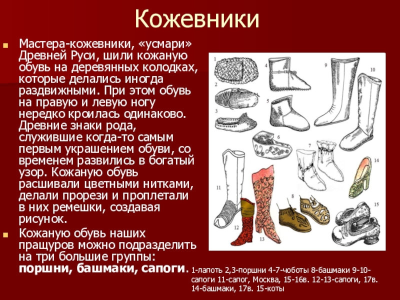 Мастера-кожевники, «усмари» Древней Руси, шили кожаную обувь на деревянных колодках, которые