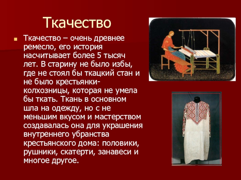 лет. В старину не было избы, где не стоял бы ткацкий стан и не было крестьянки- колхозницы, которая не умела бы ткать. Ткань в основном шла на одежду, но с не меньшим вкусом и мастерством создавалась она для украшения внутреннего убранства крестьянского дома: половики, рушники, скатерти, занавеси и многое другое.