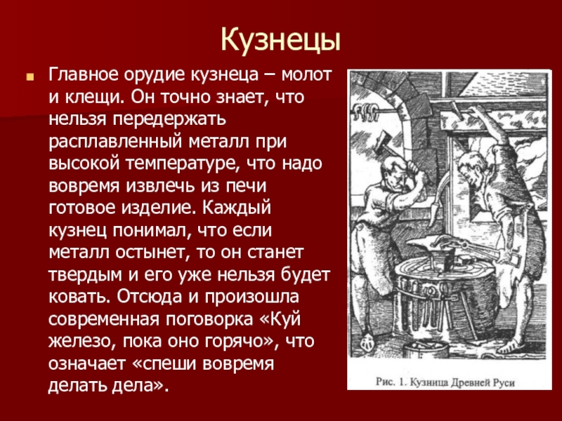 нельзя передержать расплавленный металл при высокой температуре, что надо вовремя извлечь из печи готовое изделие. Каждый кузнец понимал, что если металл остынет, то он станет твердым и его уже нельзя будет ковать. Отсюда и произошла современная поговорка «Куй железо, пока оно горячо», что означает «спеши вовремя делать дела».