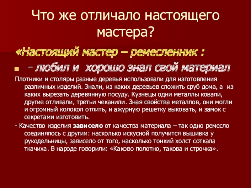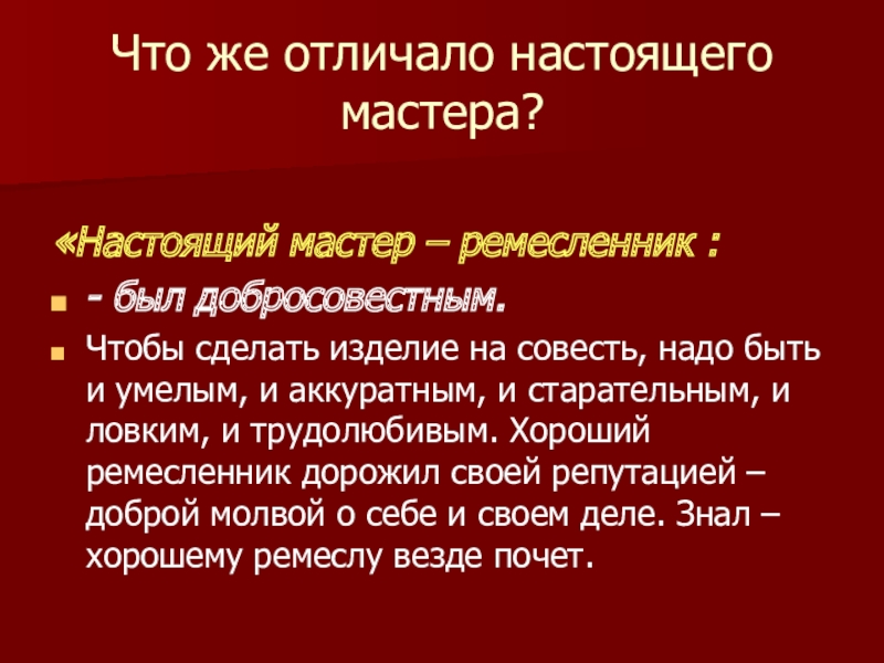Чтобы сделать изделие на совесть, надо быть и умелым, и аккуратным, и старательным, и ловким, и трудолюбивым. Хороший ремесленник дорожил своей репутацией – доброй молвой о себе и своем деле. Знал – хорошему ремеслу везде почет.