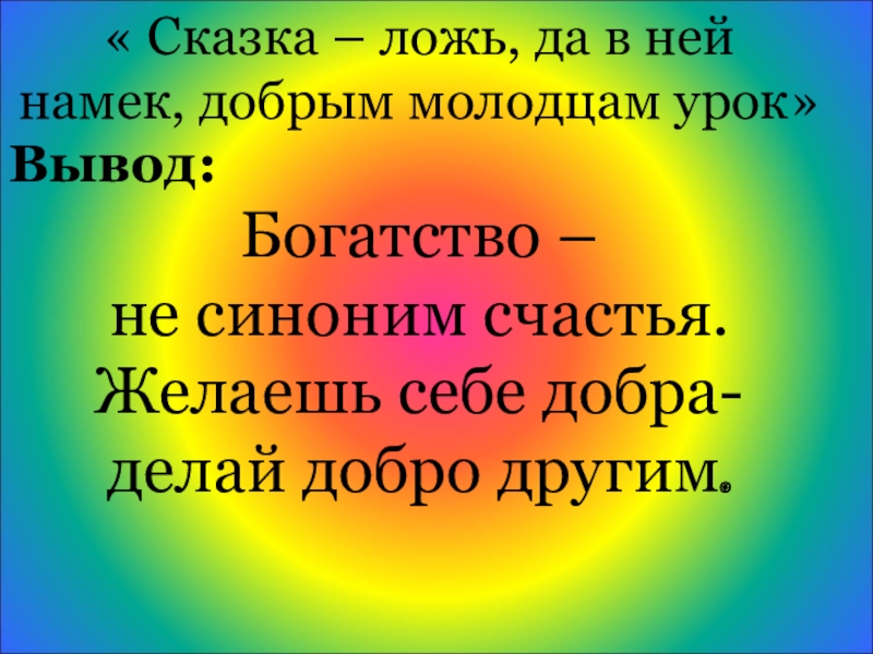 « Сказка – ложь, да в ней намек, добрым молодцам урок»Вывод:Богатство – не синоним счастья. Желаешь себе