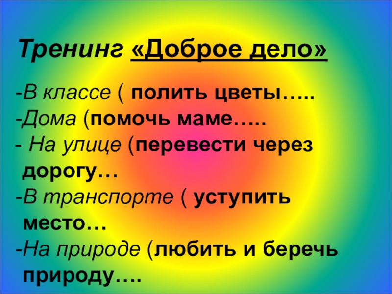 Тренинг «Доброе дело»В классе ( полить цветы…..Дома (помочь маме….. На улице (перевести через дорогу…В транспорте ( уступить