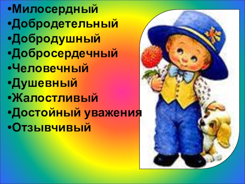 МилосердныйДобродетельныйДобродушныйДобросердечныйЧеловечныйДушевныйЖалостливыйДостойный уваженияОтзывчивый