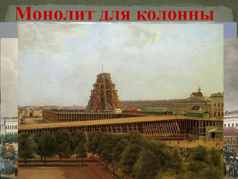 Слайд 25Первоначально Александровскую колонну обрамляла временная деревянная ограда со светильниками и гипсовыми