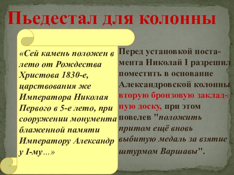 Перед установкой поста-мента Николай I разрешил поместить в основание Александровской колонны вторую бронзовую заклад-ную доску, при этом повелев "положить притом ещё вновь выбитую медаль за взятие штурмом Варшавы".