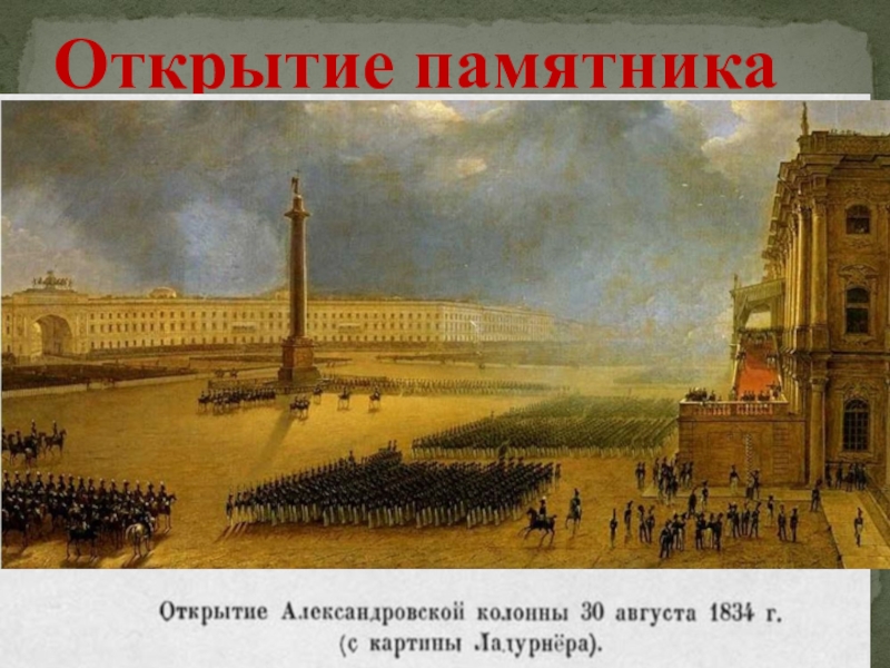 Торжественное открытие памятника состоялось 30 августа 1834 года. Перед открытием