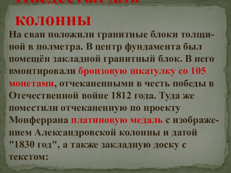 центр фундамента был помещён закладной гранитный блок. В него вмонтировали бронзовую шкатулку со 105 монетами, отчеканенными в честь победы в Отечественной войне 1812 года. Туда же поместили отчеканенную по проекту Монферрана платиновую медаль с изображе-нием Александровской колонны и датой "1830 год", а также закладную доску с текстом: