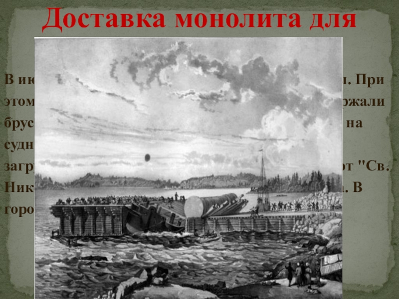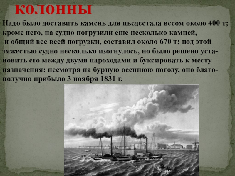 произошла авария - веса колонны не выдержали брусья, по которым она должна была вкатиться на судно, и она едва не рухнула в воду. Монолит загружали 600 солдат. До Петербурга плоский бот "Св. Николай" с колонной буксировали два парохода. В город она прибыла 1 июля 1832 года.