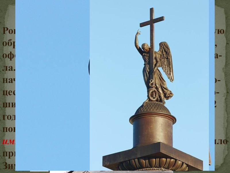 полировку), оформление её навершия, украшение пьедеста-ла. На вершине колонны Монферран перво-начально планировал установить крест. В про-цессе работы над памятником он решил завер-шить колонну фигурой ангела, 29 ноября 1832 года Николай I осматривал модель ангела и повелел "чтобы лик дать статуе покойного императора Александра". Императором же было принято решение поставить ангела лицом к Зимнему дворцу.