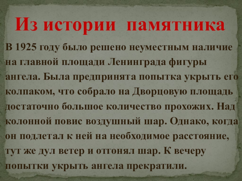 площади Ленинграда фигуры ангела. Была предпринята попытка укрыть его колпаком, что собрало на Дворцовую площадь достаточно большое количество прохожих. Над колонной повис воздушный шар. Однако, когда он подлетал к ней на необходимое расстояние, тут же дул ветер и отгонял шар. К вечеру попытки укрыть ангела прекратили.