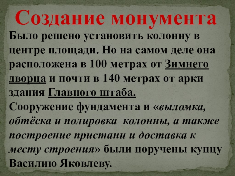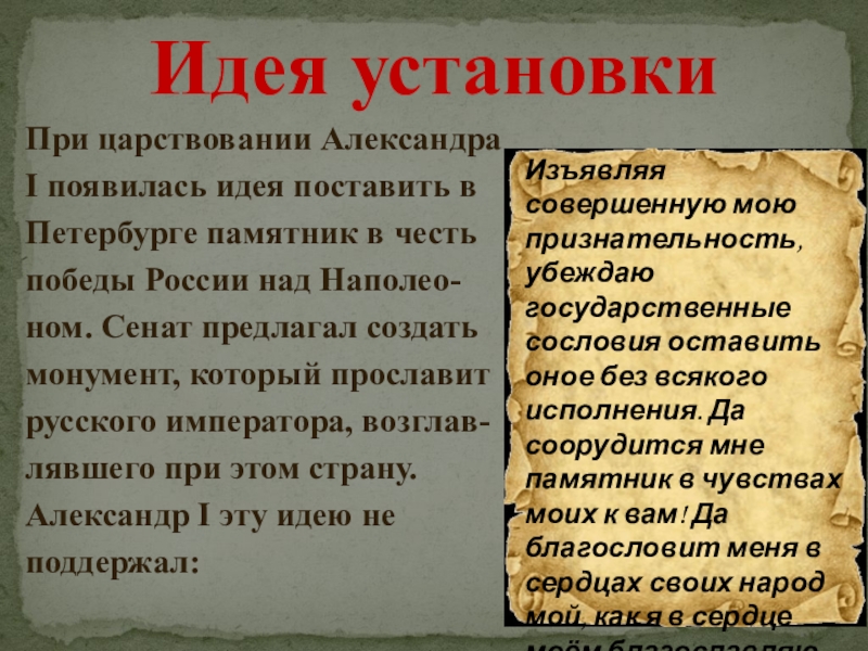 в честь победы России над Наполео-ном. Сенат предлагал создать монумент, который прославит русского императора, возглав-лявшего при этом страну. Александр I эту идею не поддержал: