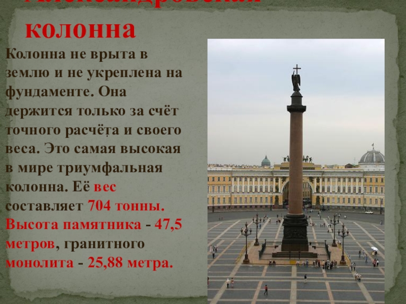 Она держится только за счёт точного расчёта и своего веса. Это самая высокая в мире триумфальная колонна. Её вес составляет 704 тонны. Высота памятника - 47,5 метров, гранитного монолита - 25,88 метра.