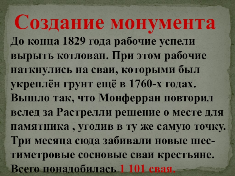 рабочие наткнулись на сваи, которыми был укреплён грунт ещё в 1760-х годах. Вышло так, что Монферран повторил вслед за Растрелли решение о месте для памятника , угодив в ту же самую точку. Три месяца сюда забивали новые шес-тиметровые сосновые сваи крестьяне. Всего понадобилась 1 101 свая.