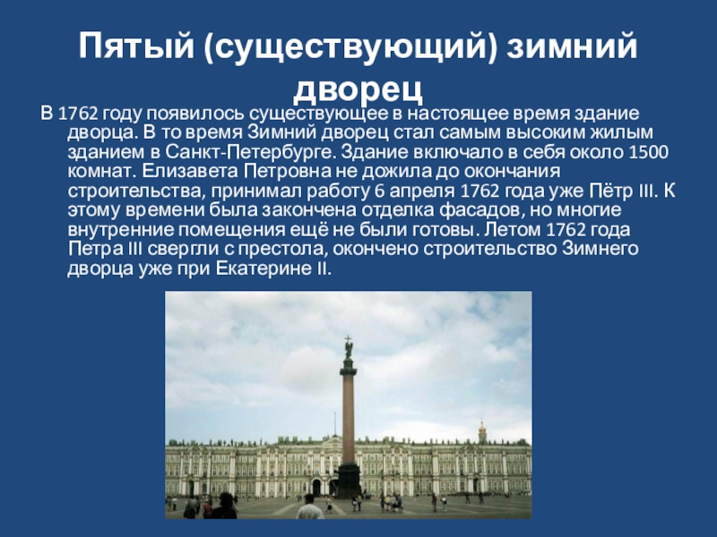 старейшим зданием на Дворцовой площади, сооруженное в стиле барокко. Как и любое здание в Санкт-Петербурге, Зимний дворец окутан историями и мифами.