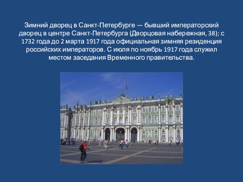 В 1918 году часть, а в 1922 году всё здание передано Государственному Эрмитажу. Зимний дворец и Дворцовая площадь образуют красивейший ансамбль современного города и являются одним из главных объектов внутрироссийского и международного туризма