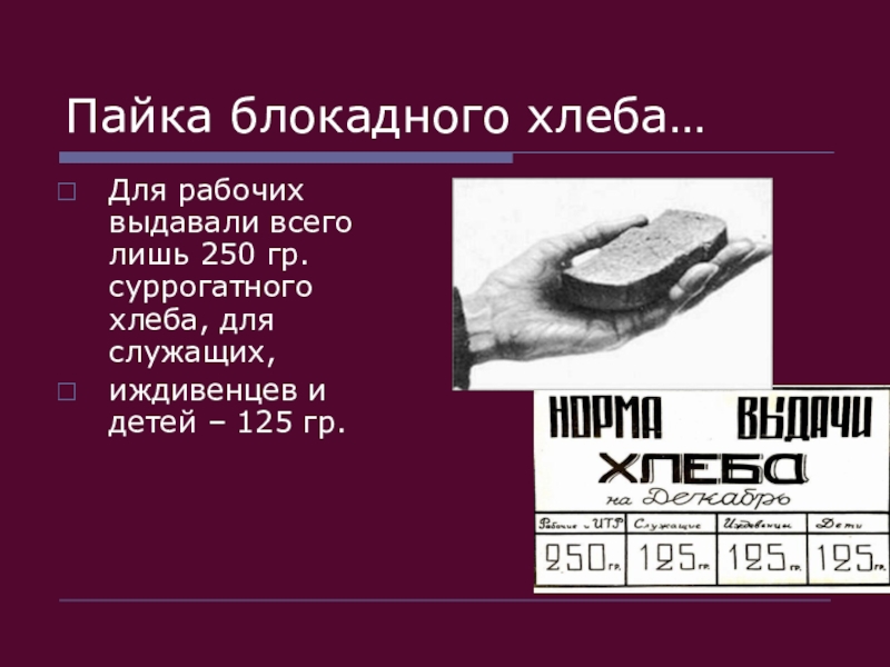 Пайка блокадного хлеба…Для рабочих выдавали всего лишь 250 гр. суррогатного хлеба, для служащих,иждивенцев и детей – 125