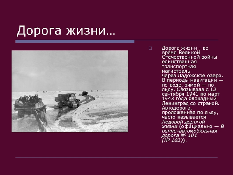 Дорога жизни…Дорога жизни - во время Великой Отечественной войны единственная транспортная магистраль через Ладожское озеро. В периоды навигации — по воде,