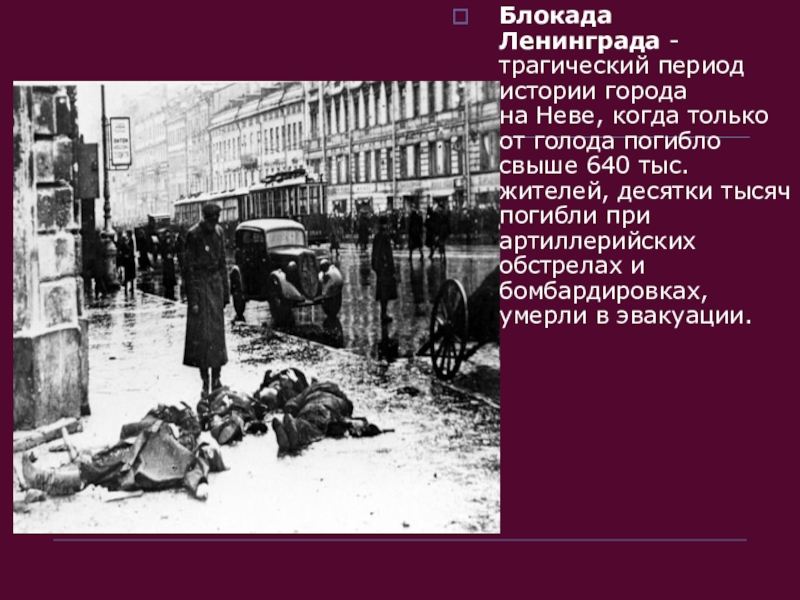 Блокада Ленинграда -трагический период истории города на Неве, когда только от голода погибло свыше 640 тыс. жителей, десятки тысяч