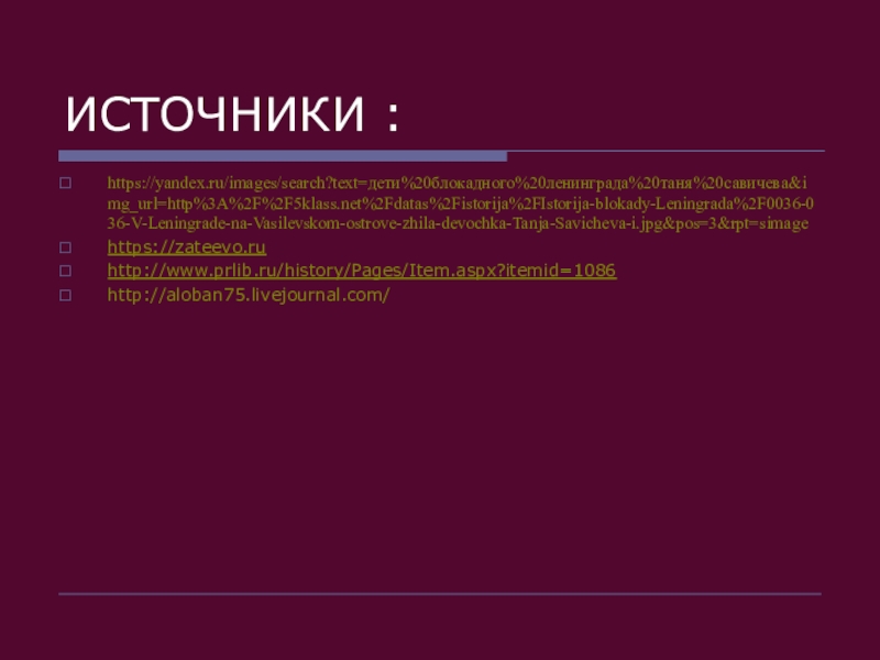 ИСТОЧНИКИ :https://yandex.ru/images/search?text=дети%20блокадного%20ленинграда%20таня%20савичева&img_url=http%3A%2F%2F5klass.net%2Fdatas%2Fistorija%2FIstorija-blokady-Leningrada%2F0036-036-V-Leningrade-na-Vasilevskom-ostrove-zhila-devochka-Tanja-Savicheva-i.jpg&pos=3&rpt=simagehttps://zateevo.ruhttp://www.prlib.ru/history/Pages/Item.aspx?itemid=1086http://aloban75.livejournal.com/