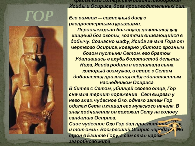 Первоначально бог-сокол почитался как хищный бог охоты, когтями впивающийся в добычу. Согласно мифу, Исида зачала Гора от мертвого Осириса, коварно убитого грозным богом пустыни Сетом, его братом. Удалившись в глубь болотистой дельты Нила, Исида родила и воспитала сына, который возмужав, в споре с Сетом добивается признания себя единственным наследником Осириса.