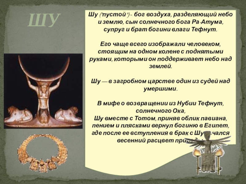 и ее муж Шу — первая пара богов-близнецов, порожденных Ра-Атумом.