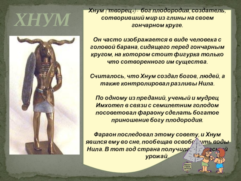 Древние верили, что Геб добр: он охраняет живых и умерших от живущих в земле змей, на нем растут нужные людям растения, вот почему его иногда изображали с зеленым лицом.