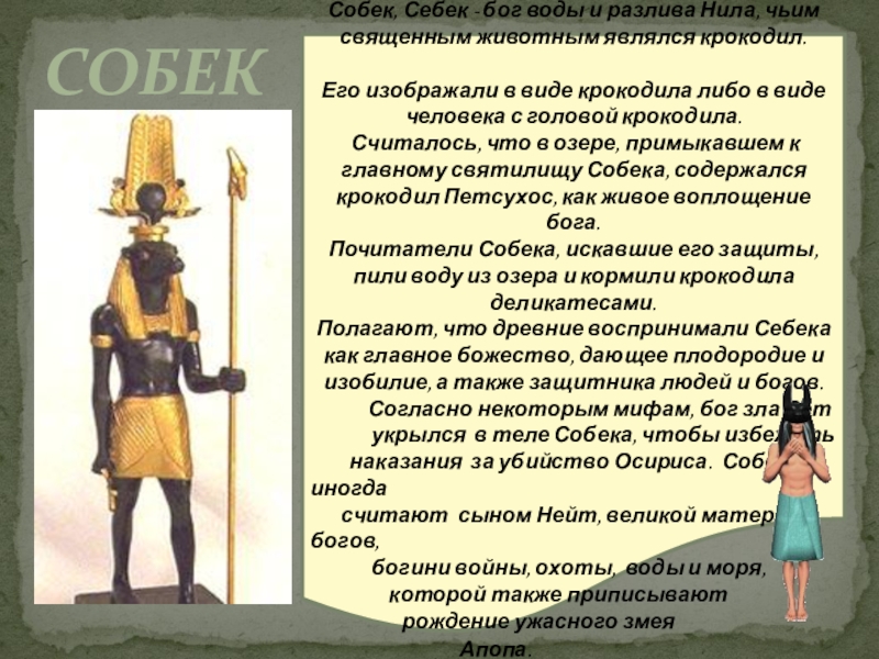Собек, Себек - бог воды и разлива Нила, чьим священным животным