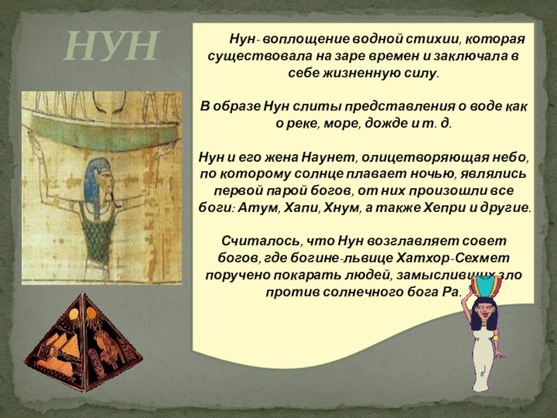 Нун- воплощение водной стихии, которая существовала на заре времен и
