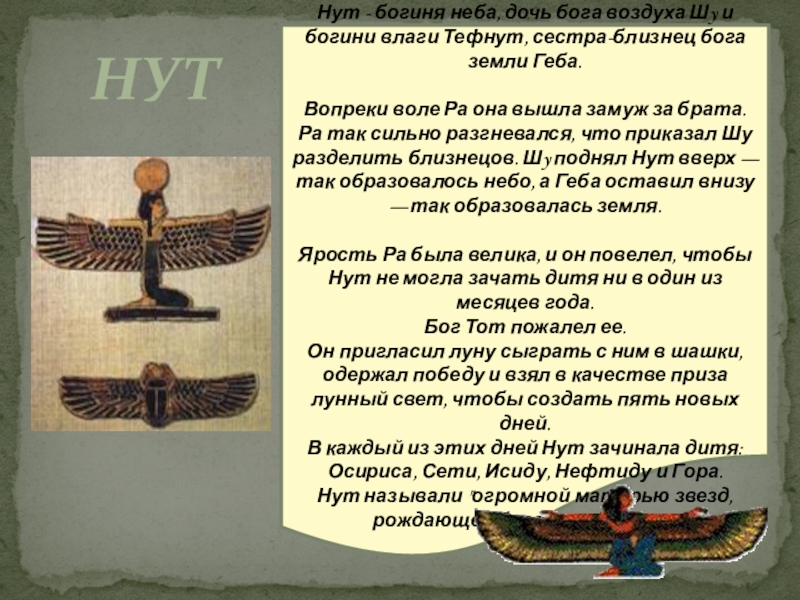 Нут - богиня неба, дочь бога воздуха Шy и богини