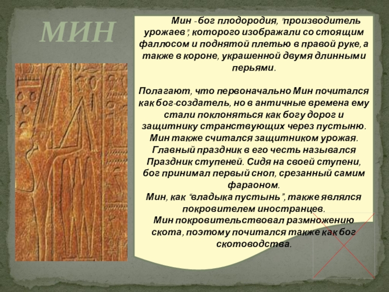 Мин - бог плодородия, "производитель урожаев", которого изображали со