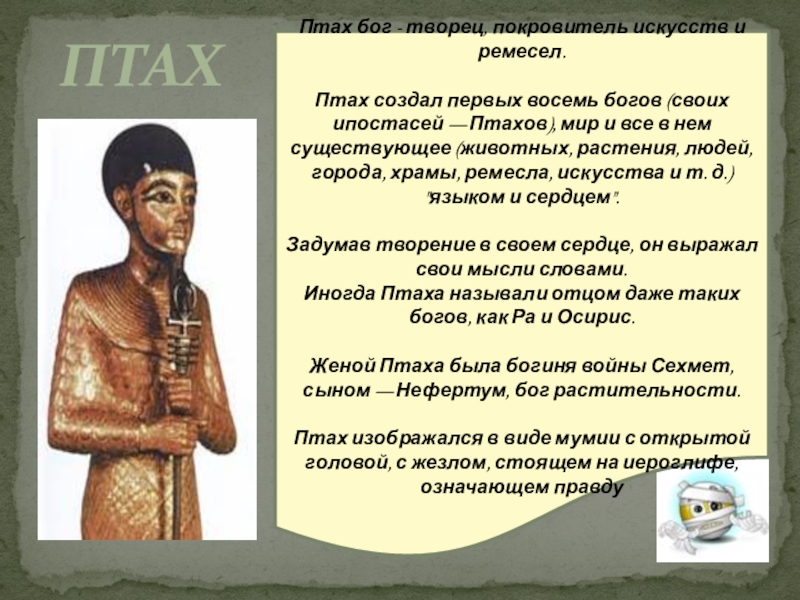Птах изображался в виде мумии с открытой головой, с жезлом, стоящем на иероглифе, означающем правду