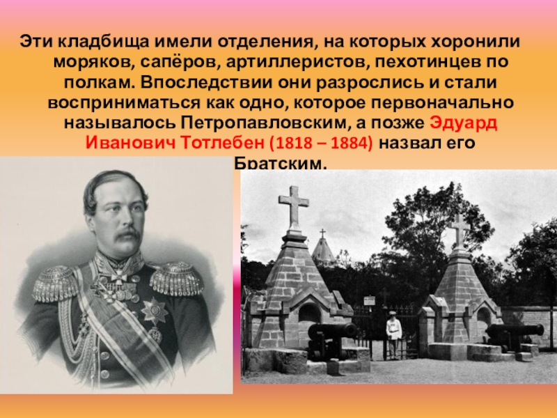 по полкам. Впоследствии они разрослись и стали восприниматься как одно, которое первоначально называлось Петропавловским, а позже Эдуард Иванович Тотлебен (1818 – 1884) назвал его Братским.
