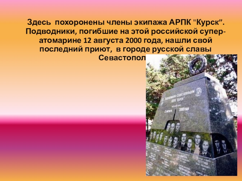 Слайд 23 Здесь похоронены члены экипажа АРПК "Курск”. Подводники, погибшие на