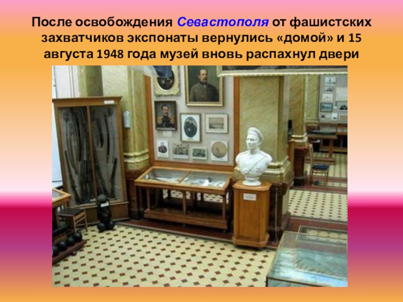 Слайд 10После освобождения Севастополя от фашистских захватчиков экспонаты вернулись «домой» и 15