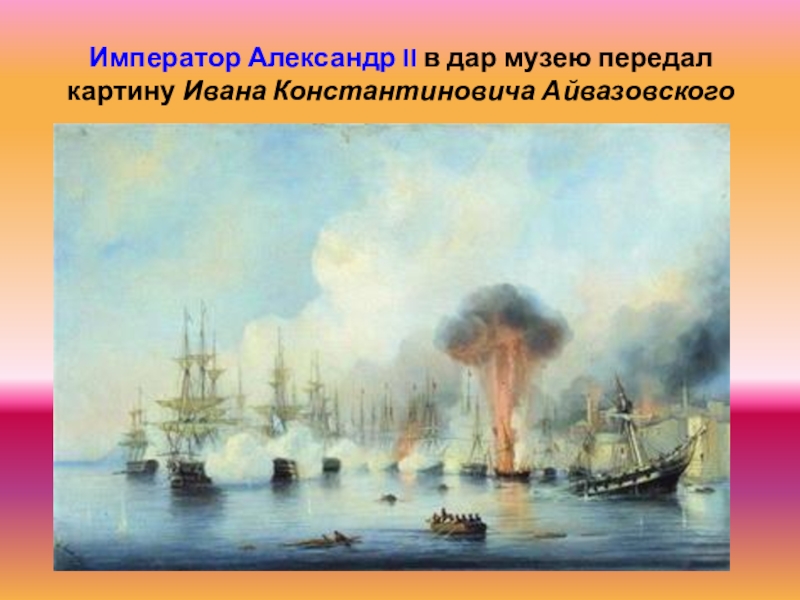 Слайд 6Император Александр II в дар музею передал картину Ивана Константиновича Айвазовского