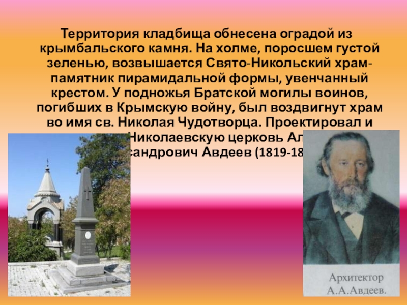 поросшем густой зеленью, возвышается Свято-Никольский храм-памятник пирамидальной формы, увенчанный крестом. У подножья Братской могилы воинов, погибших в Крымскую войну, был воздвигнут храм во имя св. Николая Чудотворца. Проектировал и строил Николаевскую церковь Алексей Александрович Авдеев (1819-1885).