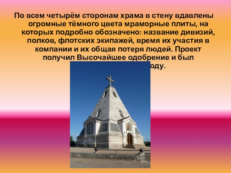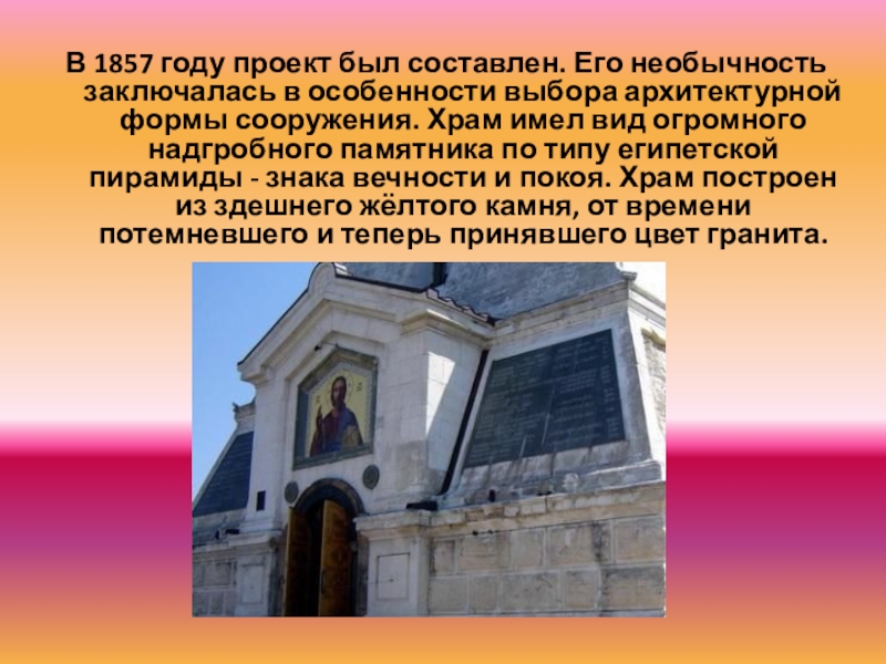 выбора архитектурной формы сооружения. Храм имел вид огромного надгробного памятника по типу египетской пирамиды - знака вечности и покоя. Храм построен из здешнего жёлтого камня, от времени потемневшего и теперь принявшего цвет гранита.
