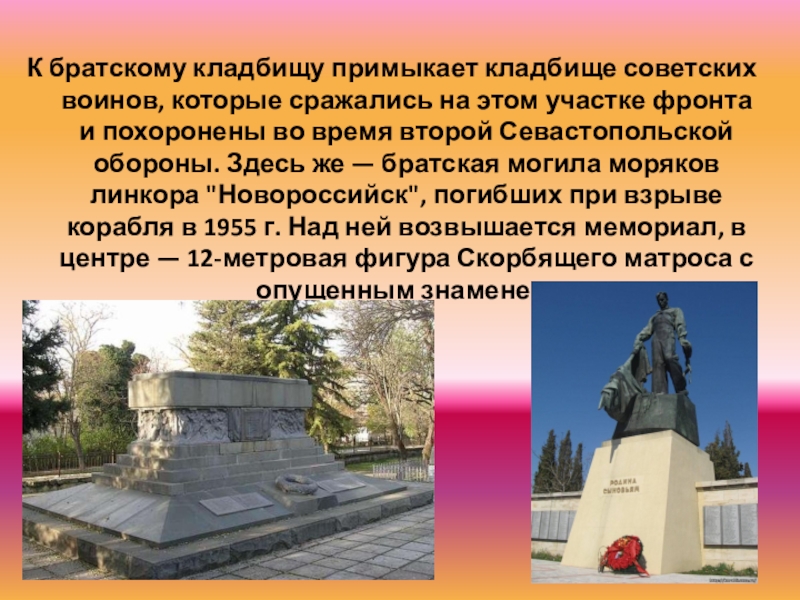 участке фронта и похоронены во время второй Севастопольской обороны. Здесь же — братская могила моряков линкора "Новороссийск", погибших при взрыве корабля в 1955 г. Над ней возвышается мемориал, в центре — 12-метровая фигура Скорбящего матроса с опущенным знаменем.