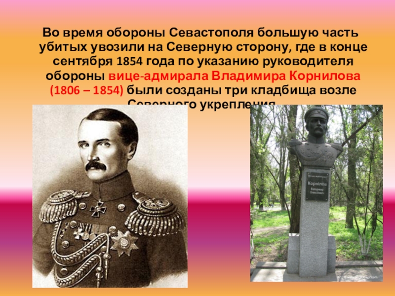 Северную сторону, где в конце сентября 1854 года по указанию руководителя обороны вице-адмирала Владимира Корнилова (1806 – 1854) были созданы три кладбища возле Северного укрепления.