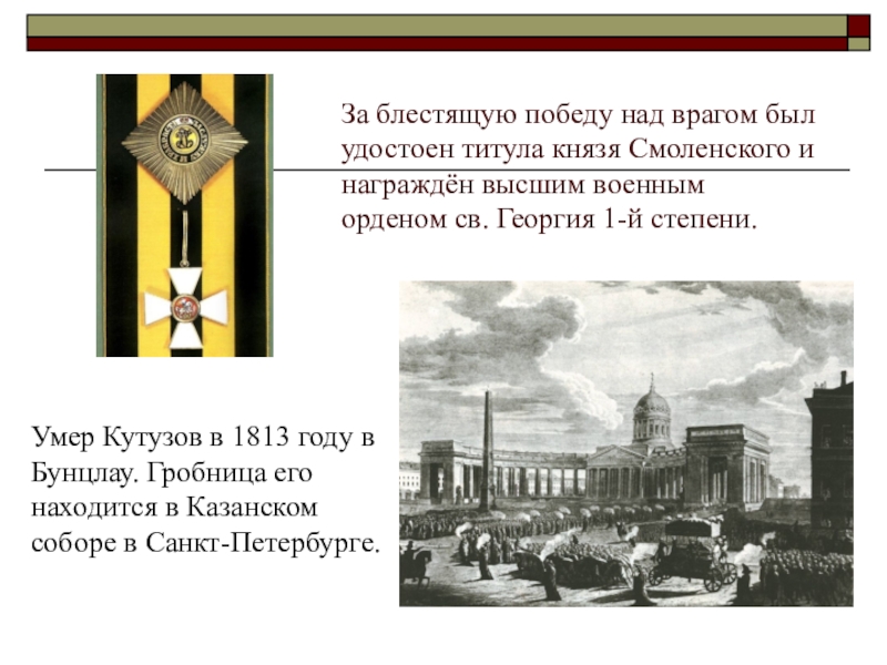 Умер Кутузов в 1813 году в Бунцлау. Гробница его находится в Казанском соборе в Санкт-Петербурге.