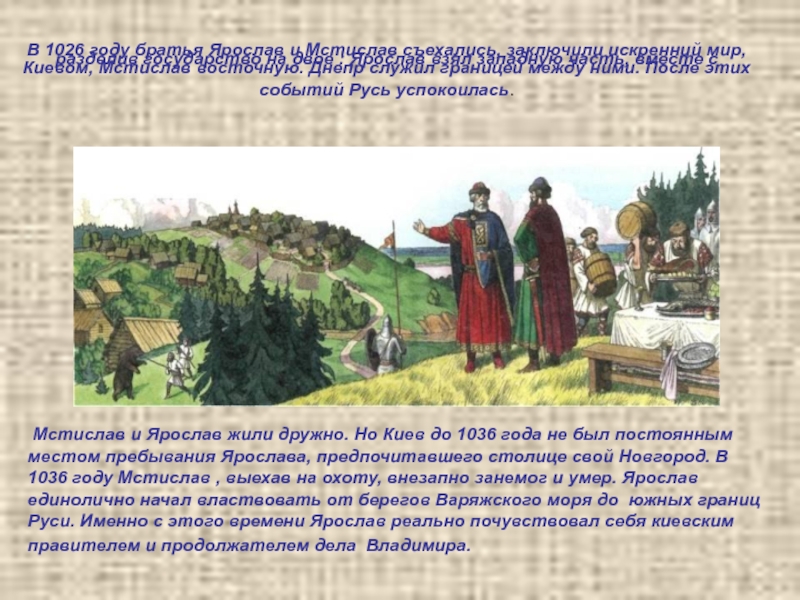 Мстислав и Ярослав жили дружно. Но Киев до 1036 года не был постоянным местом пребывания Ярослава, предпочитавшего столице свой Новгород. В 1036 году Мстислав , выехав на охоту, внезапно занемог и умер. Ярослав единолично начал властвовать от берегов Варяжского моря до южных границ Руси. Именно с этого времени Ярослав реально почувствовал себя киевским правителем и продолжателем дела Владимира.